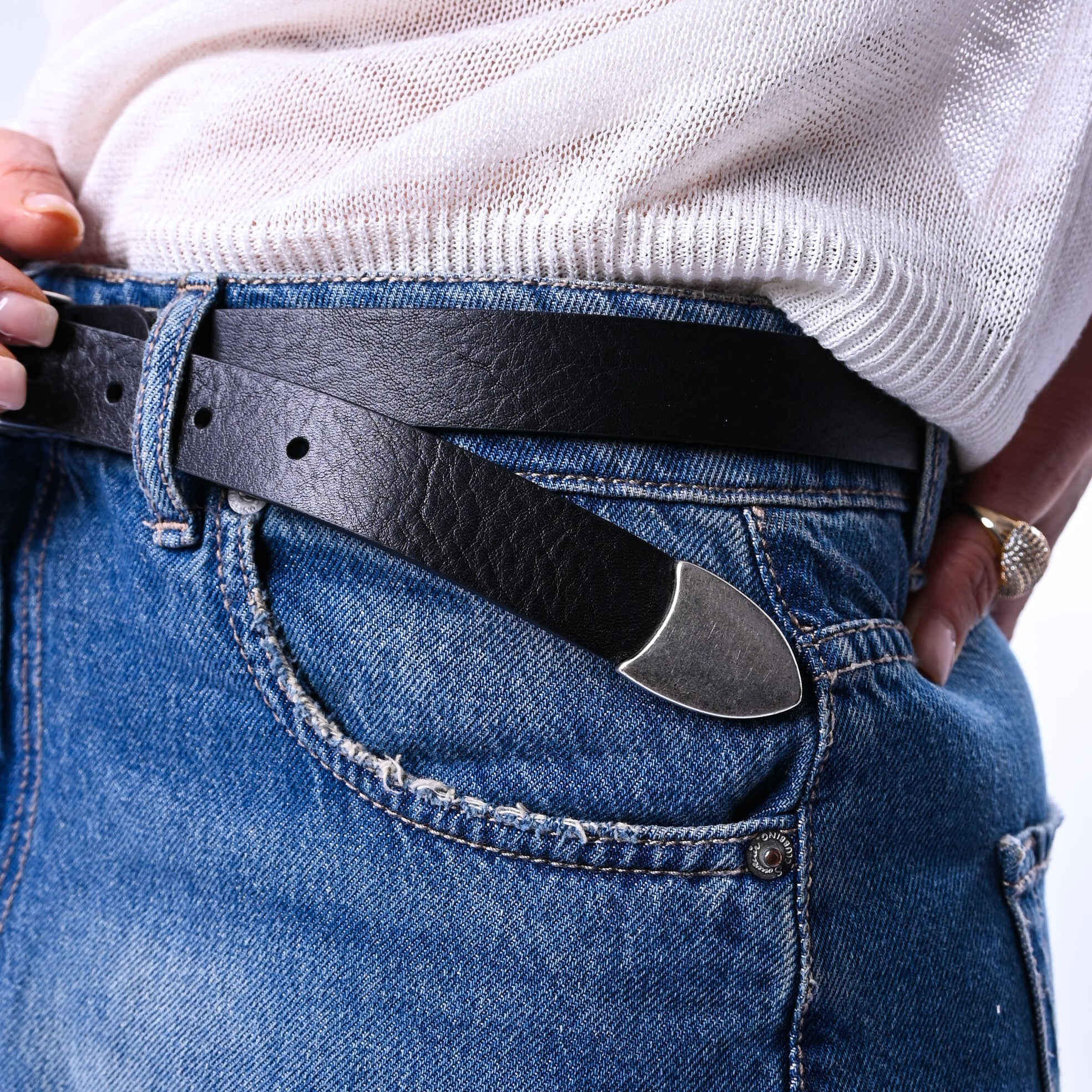 Cintura in pelle nera con fibbia western in argento anticato, un accessorio versatile che aggiunge stile e personalità a qualsiasi outfit. Realizzata con materiali di qualità per garantire durabilità e comfort nel tempo.