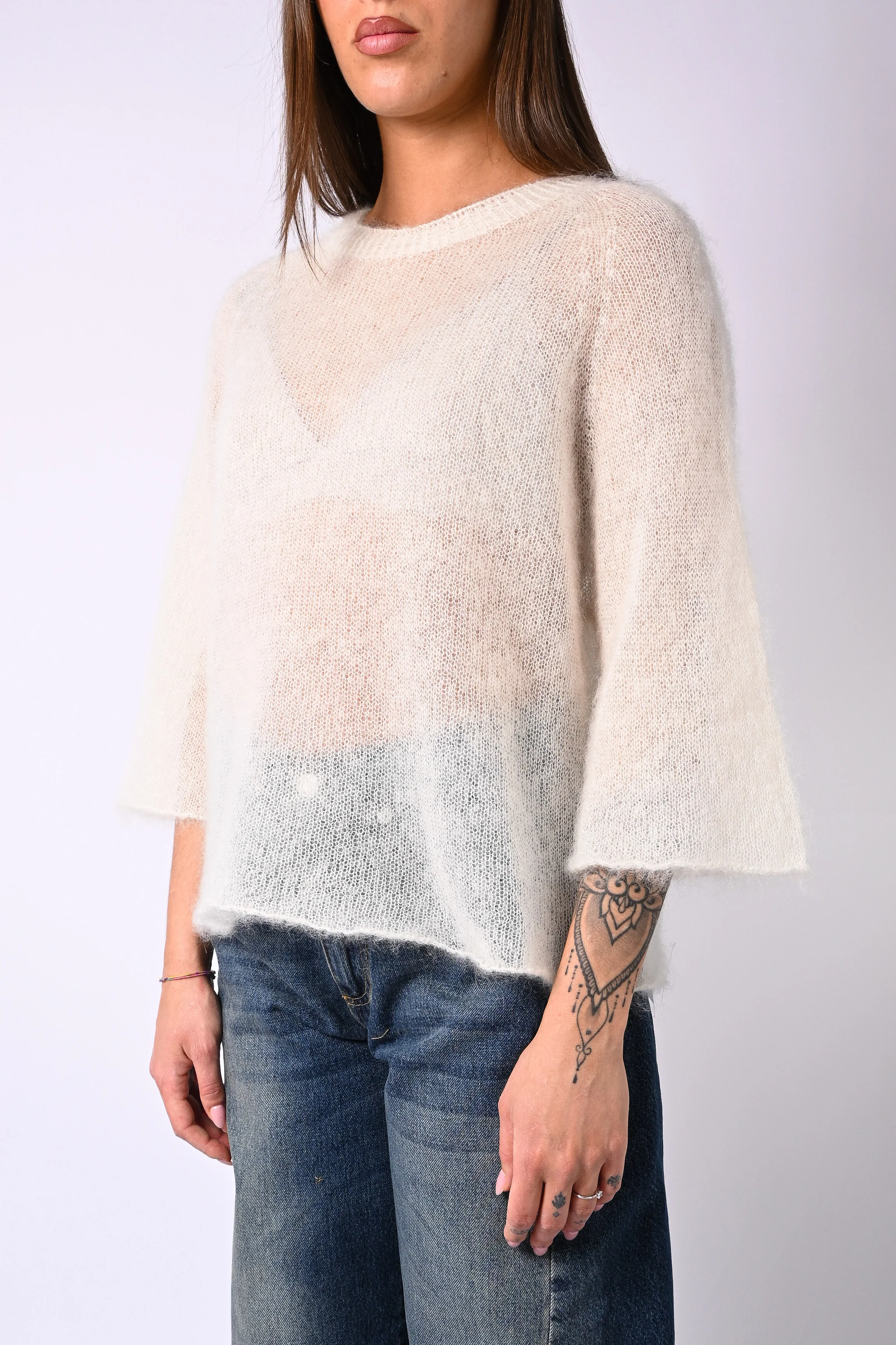 Maglia kid mohair extralight, girocollo, con manica larga a gomito, colore panna