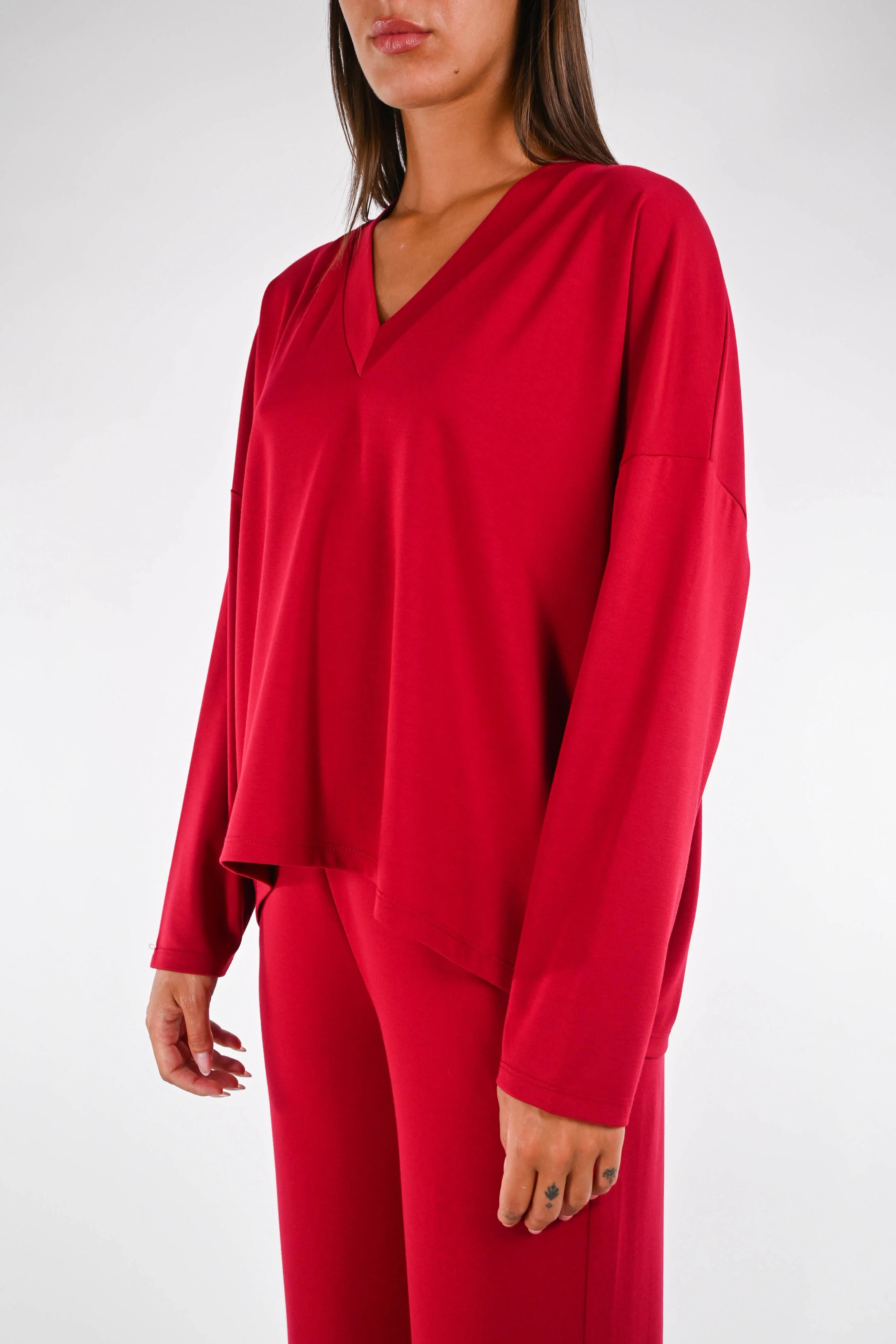 Maglia over scollo V, in leggero punto milano, con spalla scesa, più corta davanti, color rosso