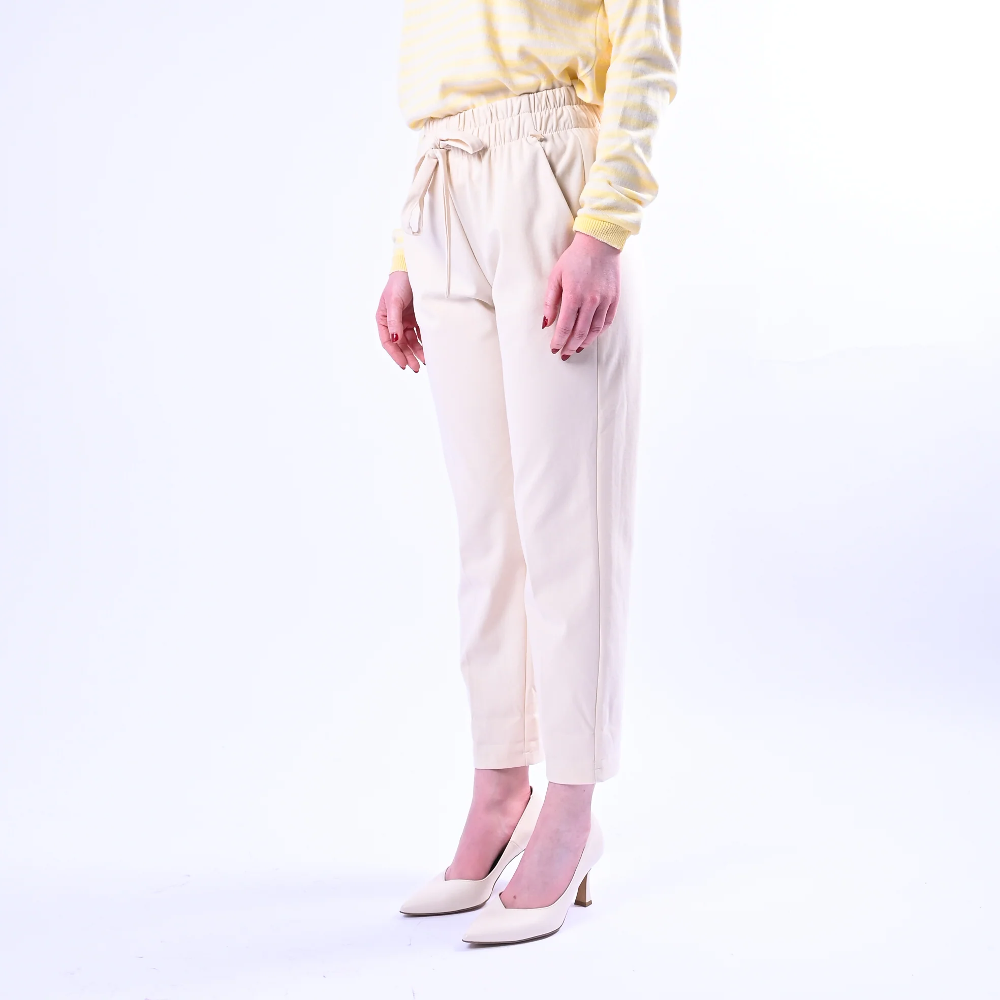 Pantalone in punto Milano elasticizzato con vita regolabile grazie a elastico e coulisse, perfetto per comfort e praticità. Tasche funzionali e design essenziale per uno stile contemporaneo e versatile.