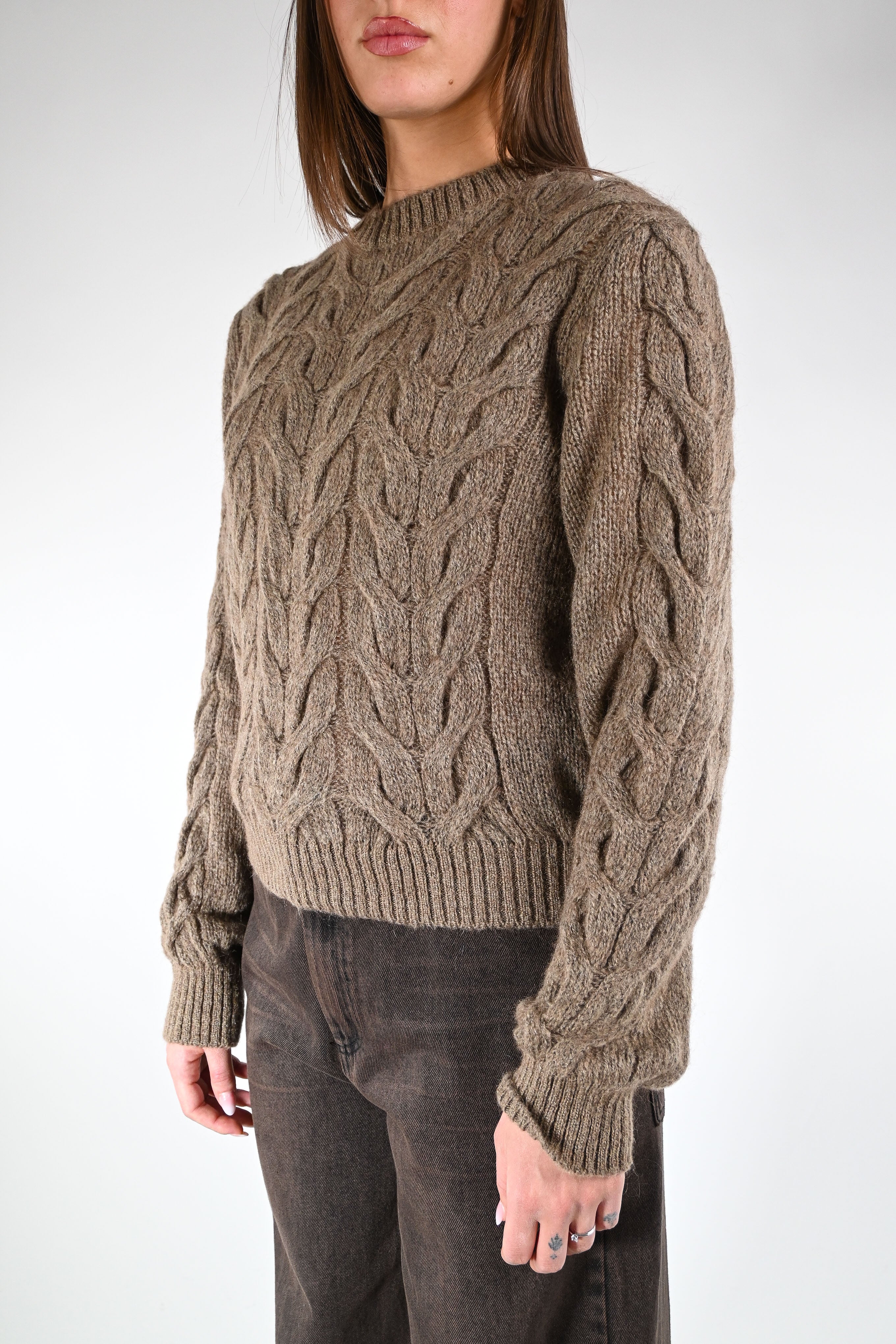 Maglia a trecce girocollo, in mosto mohair, color fango