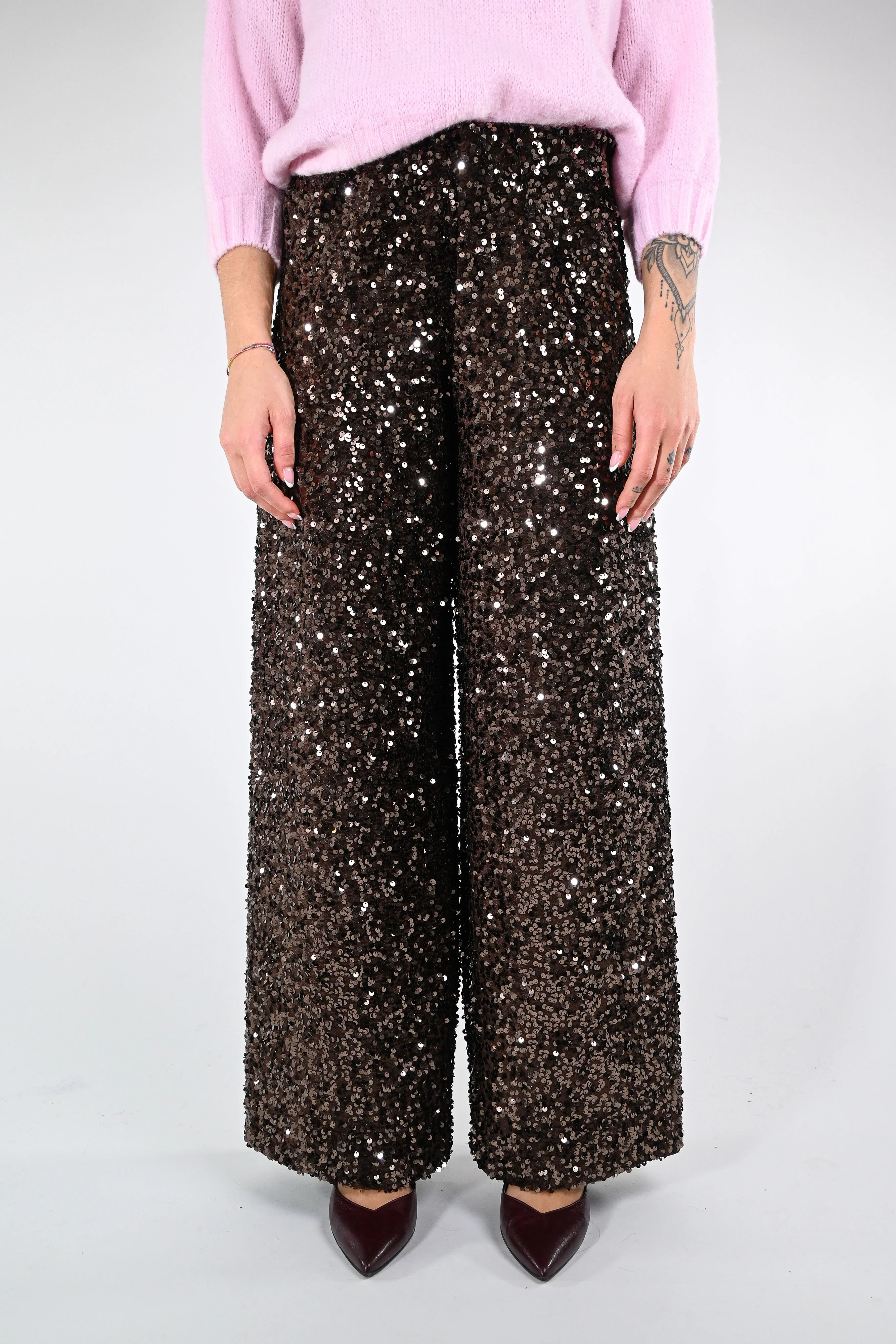 Pantalone palazzo con paillettes, con elastico in vita, color moro
