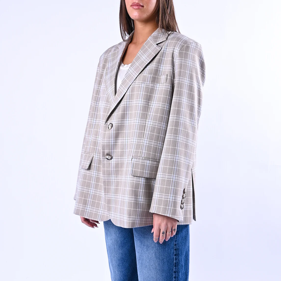 Giacca over in tartan beige e celeste con abbottonatura asimmetrica che crea un effetto dinamico e moderno. Un capo versatile e raffinato, perfetto per stratificare con stile e aggiungere carattere.